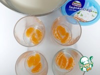 Мандарины почистить, разделить на дольки. В стаканы или десертные вазочки выложить по 3 дольки. У меня ушло 1,5 мандарина. Остальные - для украшения. |