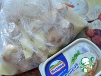 В пакет для запекания сложить грибы, картофель, посолить, поперчить, влить масло. Перемешать. Добавить сливочный сыр. |