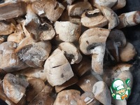 Добавить грибы. У меня замороженные четвертинками шампиньоны. Обжариваем до испарения жидкости. |