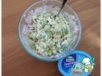 Яйца и петрушку рубим мелко. Всё отправляем в салатник. Делаем заправку. Соединяем творожный сыр с майонезом. |