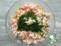 Затем добавить мелко порезанный укроп и выдавить чеснок через пресс. Хорошо перемешать. |