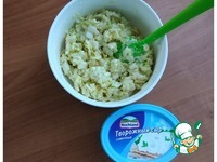 Разбиваем яйцо, добавляем сыр творожный. Сыра в ложке берём с горкой. Я буду использовать Hochland творожный сливочный. |