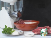 Пропустить через мясорубку мясо, жир, мяту и 2 луковицы. |