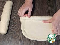 6) Каждую часть раскатать скалкой в виде прямоугольника 20 на 30 см, и свернуть в рулет. Каждый оборот прищипываю к стенками, чтобы не было пустот при выпекании. |