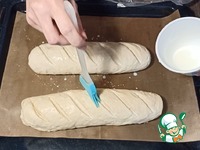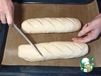 8) Через указанный интервал времени на батонах сделать надрезы. Повторно накрыть пленкой и полотенцем. Оставить на 10 мин. Тем временем включить духовку разогреваться на 180 градусов. |