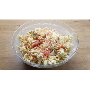 Описание: Неповторимое сочетание белого (корневой сельдерей, отварное филе грудки) и красного (мякоть грейпфрута), дополненное нежными лепестками пекинской капусты в соусе майонез и щедро сдобренное жаренными кедровыми орешками.