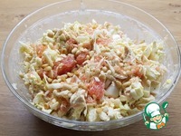Пекинскую капусту без особо толстых черешков нарезаем квадратиками. Сверху крупно рубим ножом варёные яйца. Солим салат по своему вкусу. |