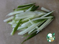Парниковый огурец чистим по необходимости и режем тонкими полосками. |