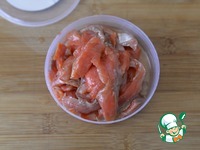 Малосольный лосось также режем тонкими полосками. У меня нерка, уже нарезанная, в масле. |