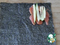 Далее первой четвертинкой листа нори накрываем четвертинку с лососем и огурцом. |