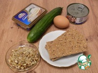 Сделать начинку. Смешать натертые яйца, орехи грецкие, размять вилкой консервы. |
