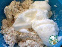 Добавляем белковую пену к творогу в два приёма. |
