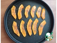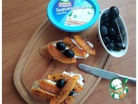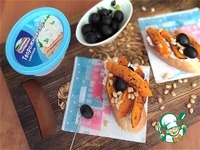 Выкладываем на сыр ломтики запечённой тыквы, дополним маслинами. Я очень люблю маслины с косточкой. |