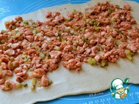 Выбродившее тесто обмять, раскатать в прямоугольник, 24*35 см.. Разложить на тесто начинку. |