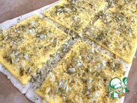 Нужно 2 такие детали. Одну переносим на смазанный пергамент на противне. Сверху примеряем пластинки сыра от Хохланд. Ушло на ёлочку 4 пластинки+наверх квадратики из 1 пластинки. |