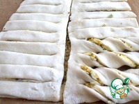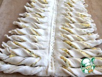 Накрыть вторым слоем теста, надрезать шпателем для теста не до конца. Шов смазать белком. Сворачиваем спиралькой каждую двухслойную полоску. |