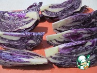 Краснокочанную капусту разрезать по кочерыжке на 8 частей. Ломтики капусты посолить и смазать оливковым маслом. |