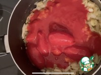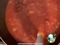 Затем добавляем томаты в собственном соку и толчем их, слегка даём прокипеть, ложем ложку сахара, соли, и чёрного перца, белое вино, томатную пасту |