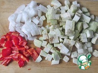 Овощи чистим, с баклажана снимаем шкурку, нарезаем лук, перец, кабачок и баклажан кубиками, чеснок мелко рубим |