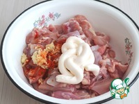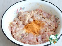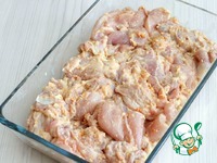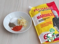 В миску с филе бедра курицы добавить пряную смесь, затем добавить 3 ст. ложки с горкой майонеза для запекания. Кусочки курицы покрыть пряной смесью и майонезом. |