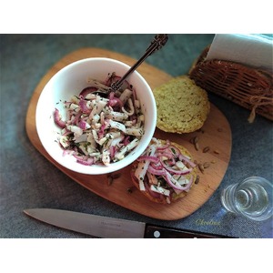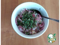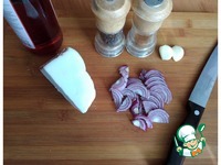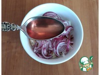 Выкладываем порезанный красный лук поверх сала по всей поверхности и поливаем его уксусом. Уксус можно использовать 7 %, я очень люблю винный из красного вина и буду его использовать. |