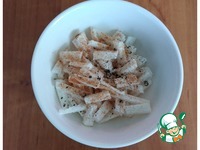 Сало нарезаем соломкой, длиной примерно 2,5 см. выкладываем в подходящую посуду керамическую. Перчим свежемолотым чёрным перцем и красным жгучим (по желанию). Это делаем по вкусу. |