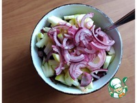 У яблока вырезаем серединку и нарезаем его произвольно небольшими кусочками., отправляем в салатник. Чтобы оно не потемнело, выложила сразу на него маринованный красный лук в винном уксусе. |