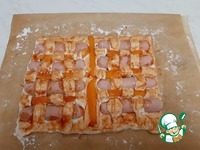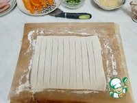 Раскатываем немного тесто на пергаменте, слегка присыпанном мукой. Делаем прорезы в тесте не доходя до верхнего и нижнего края по 1 см. |