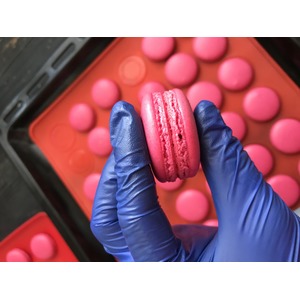 Отдельно смешать миндальную муку и белок. Добавить пищевой краситель по желанию. Вымешать до однородности, подсипая в процессе крахмал. Добавить до этой массы меренгу, размешать до однородности и отсадить макаронс на коврик с помощью кондитерской насадки 1А. Выпекать 12-25 минут при 140 * в электрической духовке. |