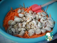 Горячим переложить в морковно-грибную смесь. Зелень нарубить, добавить. Перемешать, довести на вкус соль/сахар, перец/чеснок. Остудить. |
