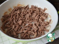 На растительном масле пожарить говядину, огонь сильный, 5 минут, помешивая. |