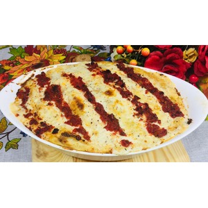 форму смазываем томатным соусом. Блинчики смазываем начинкой, посыпаем тертой моцареллой и сворачиваем трубочкой. выкладываем в форму покрываем сверху соусом бешамель и рисуем полосочки томатным соусом.