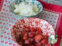 Творог смешать с сахаром. Замороженную клубнику разморозить, если крупная, нарезать. |