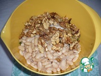 Туда же в чашу добавляем отваренную фасоль, мякоть запеченного баклажана, поджаренные грецкие орехи, оливковое масло. Посолить по вкусу. |