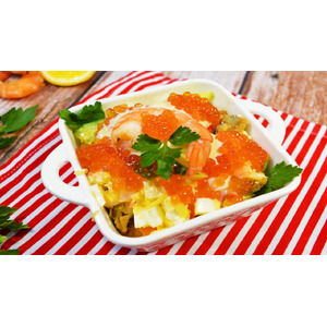 Описание: Такой салат с морепродуктами станет украшением любого праздничного стола. Он получается очень изысканным и шикарным. Конечно, это блюдо не на каждый день. Бюджетным его не назовёшь. Но ведь кроме будней иногда бывают и праздники, когда можно побаловать себя и своих близких. Если этот салат заправить йогуртом, то его можно отнести к блюдам правильного питания.
