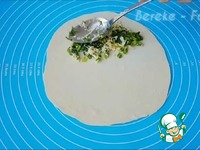 Тесто делим на равные части, раскатываем тонко, выкладываем начинку и скрепляем края |