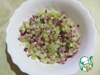 Лук и сельдерей выложить в миску, добавить соль, сахар и винный (либо яблочный) уксус. Перемешать и оставить мариноваться на 5 минут. |
