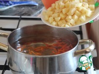Когда картофель будет почти готов отправляем в кастрюлю вермишель. |