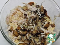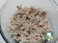 Отварить куриное филе в кипящей подсоленной воде 20 минут. Дать остыть. Разобрать на волокна. |