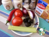Сельдерей нарезать тонкими слайсами, помидоры нарезать дольками, перец чили измельчить. Добавить маслины и маринованный лук. |