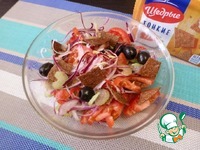 Положить в салат кусочки хлебцев, приправить солью, перцем, оливковым маслом и аккуратно перемешать. Отправить салат в холодильник на 30 минут настояться. |