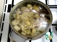 Цветную капусту нужно разделить на соцветия, промыть и отварить в подсоленной воде примерно 5 минут. |