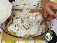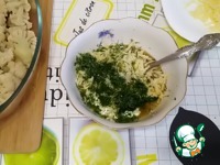 Наливаем сметану или сливки. Добавляем измельченный чеснок, натертый твердый сыр (но не весь, а только половину), зелень (у меня - укроп). Перемешиваем заливку. |