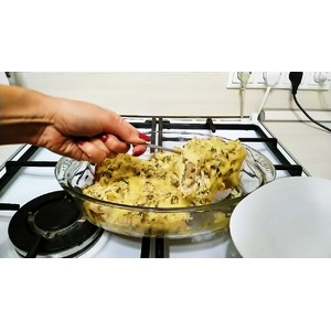 Откидываем капусту на дуршлаг. Перекладываем в форму для запекания. |