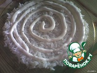 Выкладываем рис слоем примерно 0,5 см, немного присаливаем, сбрызгиваем лимонным соком и смазываем майонезом |