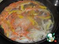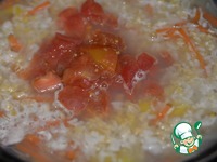 Кладём овощи в кастрюлю или сотейник, заливаем водой, кладём рис и чечевицу. Доводим до кипения и варим на медленном огне 15 минут. |
