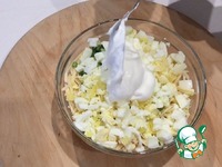 Готовим начинку. Смешиваем сыр, зелень, вареные яйца, сметану и соль. |