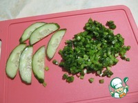 Кружочки огурчика разрезать вдоль пополам. Лук мелко порезать. |