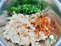 Зеленый лук мелко нашинкуем. Соединим в миске капусту, рис и зеленый лук, тщательно перемешаем. |
