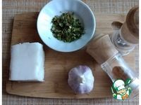 Взяла кусок сала солёного. Шкурку срезала, она у меня жёсткая. Укроп у меня замороженный и порезанный. Чистим чеснок. |